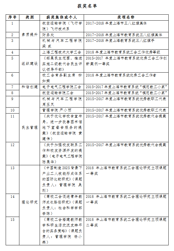校工会连续三年被评为上海市教育系统工会工作优秀等级;民主管理建设成效显著,民主评议工作成为我校“教工之家”品牌建设获奖案例之后又一个在全市高校系统推广的典型案例;教代会的民主作用发挥更加显著,优秀教代会代表和优秀提案在市教育系统评选中均取得新突破;“三年改造计划”助力基层教工小家提档升级,目前已有12家荣获上海市教育系统“模范教工小家”称号;工会理论研究成果进一步实现数量和质量“双翼齐飞”,在2018年上海市教育系统工会理论研究评比中,我校2项课题荣获一等奖,1项课题荣获二等奖。