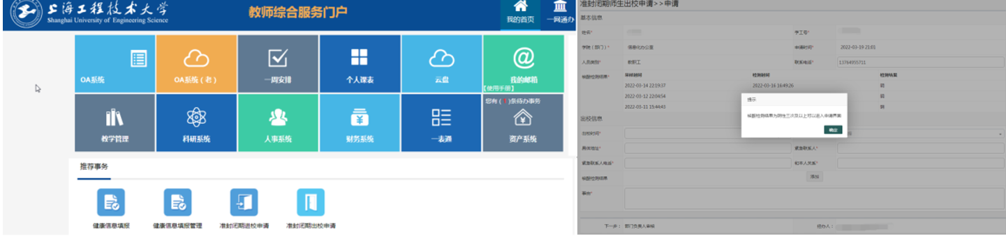 为了实现准封闭管理期间师生出入学校的动态管理,近期信息化办公室牵头开发并上线准封闭期师生离返校申请系统,符合进出校规定的师生,通过登录门户即可访问申请。审批办结情况和校园码系统实时对接,实现离返校师生动态管理。