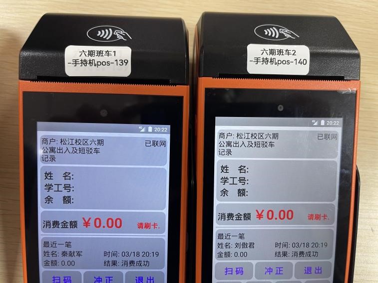 为了做好准封闭管理期间六期公寓研究生出入松江校区的安全管理,学校安排短驳车进行接送。为了确保工作顺畅进行,信息化办公室安排人手配合相关部门和开发公司共同打造班车在线预约系统。六期公寓研究生可在当天上午提前预约第二天的接驳车,经审批同意后即可正常乘车。工作中,部门还联系公司在六期公寓的四栋研究生宿舍和短驳车上都部署了经过改造的手持POS机等刷卡设备,实现师生刷卡签到信息实时汇集到学校数据中心。