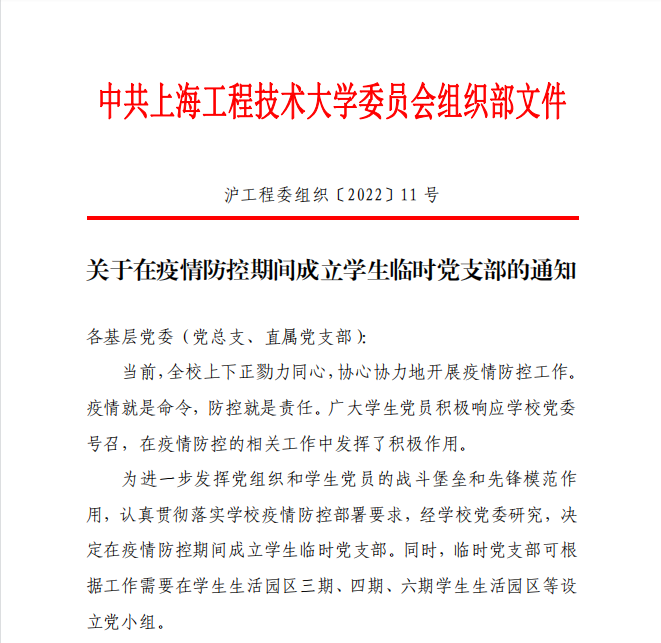 为贯彻落实上海市、学校疫情防控工作部署要求,提高科学精准防控水平,打赢疫情防控这场大仗硬仗,学校各级党组织坚持师生至上理念,闻令而动,密切配合、全力协调,党组织强化政治引领,党员师生冲锋在前,多措并举筑牢战疫防线,为打赢疫情防控硬仗提供坚实的组织保障。