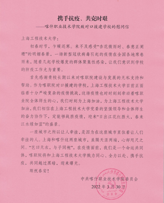 4月1日,我校收到了中共喀什职业技术学院委员会发来的慰问信,在新型冠状病毒感染的肺炎疫情防控形势严峻之际,喀什职业技术学院党委向我校师生致以亲切的问候和诚挚的关怀。信中写到,“一座城市之所以让人牵挂,是因为在这座城市里住着让人们牵挂的人。”“在疫情面前,我们是一个命运共同体,喀职院将和上海工程技术大学勠力同心、全力以赴、携手抗疫,共同越过黑暗,迎来曙光。”