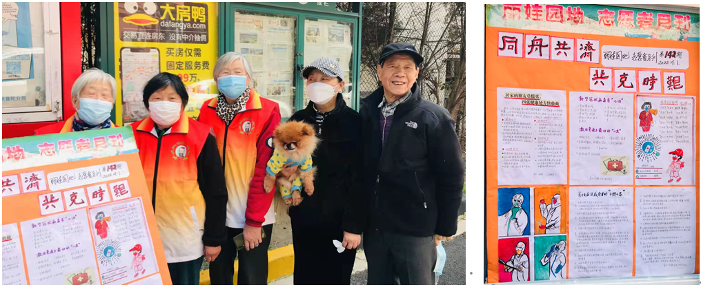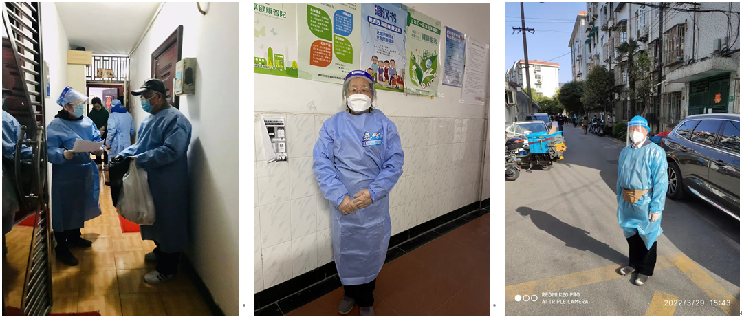 年逾八旬的曹丽纳老师,作为普陀区长风街道丽娃爱心志愿队队长,制作手绘海报,图文并茂地宣传防疫知识,增强居民抗击疫情的信心,组织楼组长配合居委通知每户参加核酸检测,发放"抗原检测"试剂,帮助老人测试,发放小区出入证,鼓励居民同心同德,战胜疫情。
