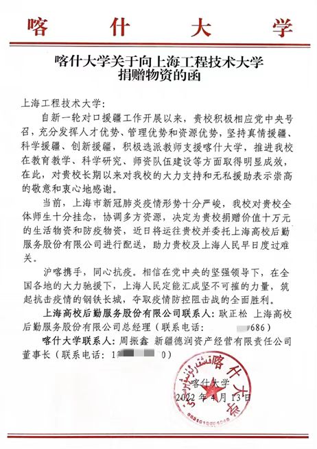近日,我校收到《喀什大学关于向上海工程技术大学捐赠物资的函》,在上海疫情防控形势严峻之际,喀什大学向我校师生致以亲切的问候和诚挚的关怀,并捐赠价值10万元的生活物资和防疫物资支援我校抗疫工作。