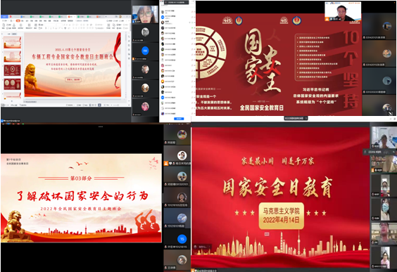 党委办公室组织学校安全稳定工作小组成员观看国家安全教育宣传片;保卫处利用微信公众号推出 “全民国家安全教育日”小讲堂,推送与国家安全教育有关的微课视频;信息化办公室举行在线网络安全培训,邀请校外专家作网络安全主题报告并通报学校网络安全事件;保密办公室联合人事处制作《提高保密意识,筑牢安全防线》专题报告;国际合作与交流处在微信公众号上开展了《中华人民共和国境外非政府组织境内活动管理法》的普法宣传;教务处通过腾讯会议与全校师生共享中国慕课优秀课程资源“西安交通大学刘玉清副教授主讲的《国家安全概论》”;研究生处在前期加强研究生复试和稳定工作,对参加复试的工作人员进行安全稳定宣传教育。