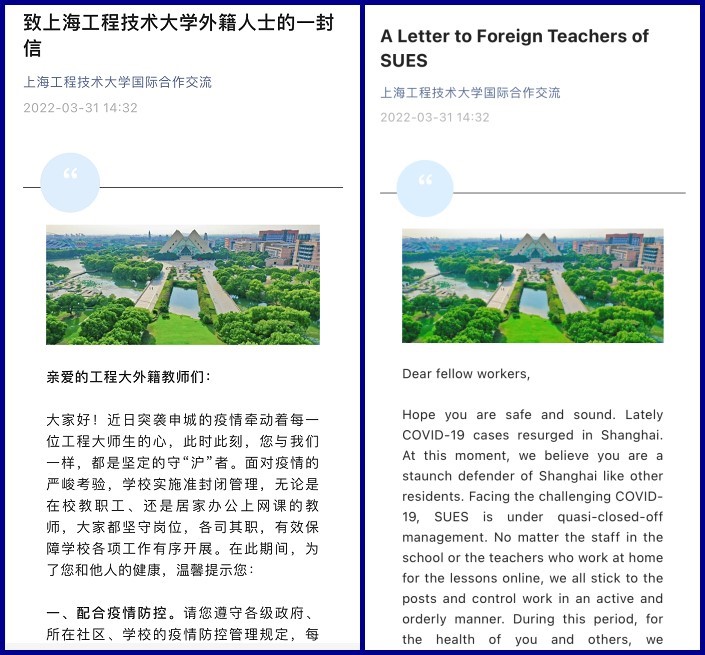 此轮上海疫情发生以后,国际合作与交流处第一时间起草了《致上海工程技术大学外籍人士的一封信》,号召外籍教师配合疫情防控、关注权威信息和加强自我防护,做坚定的守“沪”者。同时,会同相关学院,主动关心和解决外籍教师的困难和诉求,为外籍教师疫情期间有序开展线上教学及科研活动提供保障。