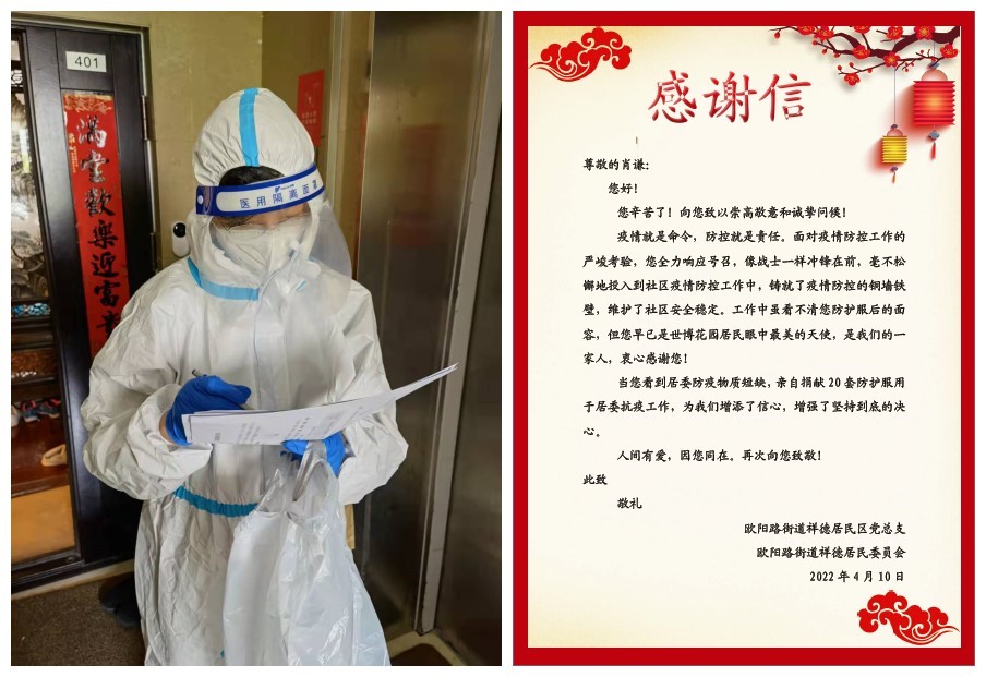 国交处党支部党员积极亮身份、见行动,“疫”不容辞地冲锋在社区抗疫志愿服务一线,党员和入党积极分子赴社区报到率为100%。肖谦同志充分发挥党员干部先锋模范带头作用,几乎每天都奋战在小区抗疫第一线,协助开展核酸检测、分发抗原检测试剂、搬运各类物资,哪里有需要哪里就有她的身影。她还捐献20套防护服用于居委抗疫,所在居民区党总支特别发来感谢信。