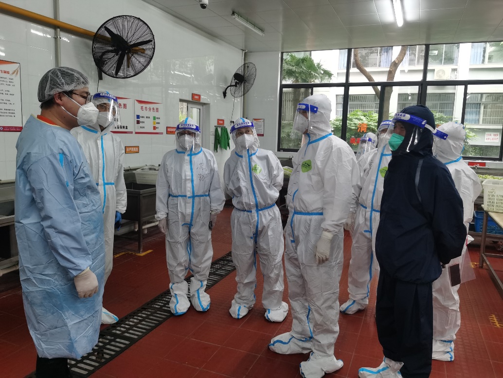 在食堂,李江书记详细询问了物资接收存储、后厨切配、分装、冷链等后勤保障相关情况。他指出,食堂是后勤保障的重中之中,绝对不能破防,他要求工作人员做好自身防护,严格遵守防疫手势,细化防控措施,确保食堂安全有序运行。