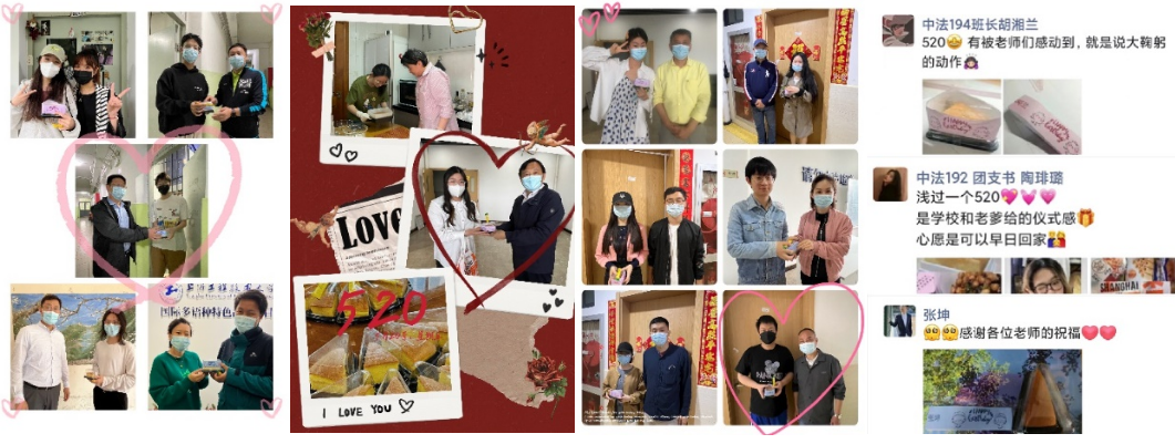 人生总有不期而遇的温暖。生日,对于每个人来说,无疑是意义非凡的,那么,当“生日”遇上“疫情”,会是怎样的体验呢?答案是满满惊喜!专班成员、产业管理办公室企业管理科科长彭文豪老师根据专班“5.20主题系列活动”策划,发动家属(原后勤实业发展中心党总支书记黄文洁及程园二代彭蕾校友)亲手制作芝士戚风蛋糕,通过安全、卫生的渠道送至长宁校区,表达了工程大人对驻守校区师生员工的关爱。“生日蛋糕”经规范消杀后,专班全体12位成员分别来到宿舍区、学习区,一对一地给12位在5月份过生日的学生送去生日蛋糕,并送上诚挚的祝福。“感恩学校,感谢老师,真是一个难忘的生日!”“有被老师们感动到”“浅过一个520,是学校给的仪式感。上海加油,早日解封!”同学们喜悦之情溢于言表,开心地纷纷在朋友圈晒着幸福,感谢学校的用心和对他们的关爱。亲爱的同学们,你们灿烂的笑容便是我们最大的幸福,生日快乐!