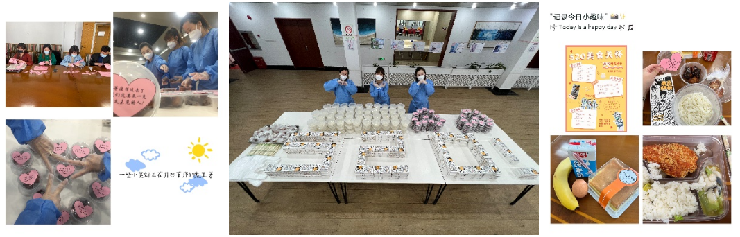 校园闭环管理以来,长宁校区食堂严格按照防控要求保障食材供应和食品安全,让在校的师生们吃得营养,吃得放心,从凌晨到深夜,封闭的校园里“写满”了后勤人忙碌的身影。虽然食堂师傅们已动足脑筋在有限的菜品中不断翻新花样,尽可能的满足学生们对菜品的需求,但巧妇难为无米之炊,受物流的影响,长宁校区的食材相对较为匮乏,在长时间校园封闭的客观因素下,三餐难免会食之无味。于是,专班成员、保卫处副处长周家樑老师动足脑筋,积极联系江明远和余国喜等校友捐赠了一批蛋糕、鸡翅、鱼制品和水果等,在长宁专班充分的讨论、细致的策划以及食堂的大力支持下,结合上海市慈善基金会捐赠的“渣渣灰”南昌拌粉和新疆喀什大学捐赠的牛奶馕,决定在5月20日这天重磅推出“5.20美食关怀套餐”,来一场轰轰烈烈的味蕾大作战!对于天天吃米饭的学生族来说,中午的南昌拌粉实在是吃得畅快淋漓:红彤彤的麻辣萝卜干,酥脆的花生米,香气扑鼻的榨菜,辣椒油和香油,根据自己的喜好搭配着食堂精心烹制的南昌拌粉,口感筋道爽滑。尤为值得一提的是,为了感谢和鼓励学生们在疫情期间对疫情工作的支持与配合,长宁疫情防控专班成员们非常用心地将一些贴心的话语写在纸上,并亲手剪成爱心形状,一一贴在餐盖上:“疫情是场大考,我们都是答题人,愿你交出完美答卷”“点滴微光,可成星海。你的每一份努力与付出,终将值得”“愿你所愿,爱你所爱”……希望学生们读着这些文字,感受老师们浓浓关心关爱的同时,也能有所触动和启发。请再坚持一下啊,胜利终会到来!