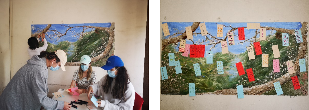 “早日解封,早日回家,要吃好多好吃的!”“去海边看日出,去青海旅游”“抢票成功,天天绿码”在长宁校区的综合楼墙上,多了一面由专班成员、纺织服装学院董琳老师携服装与服饰设计(中法合作)白明君同学策划创作《祈·盼》心愿墙,以象征美好及希望的樱花为灵感,唤醒自己心底的心声并种下期盼,由白明君同学完成此幅装饰性油画。5月20日中午,专班在综合楼门口举办《心愿祈福·为爱发声》活动,提供各种颜色的心愿纸张和马克笔,在校学生们错时错峰,写下自己内心最为真挚的愿望并固定于心愿墙上,期待愿望早日实现。