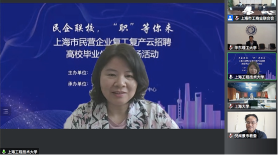 校党委副书记、副校长朱晓青在上海市教委与上海市工商联联合举办的“上海市民营企业复工复产云招聘——高校毕业生就业专场活动”中,为学校2022届毕业生带岗直播,面向120余家优质民营企业的3000余个岗位直荐毕业生。