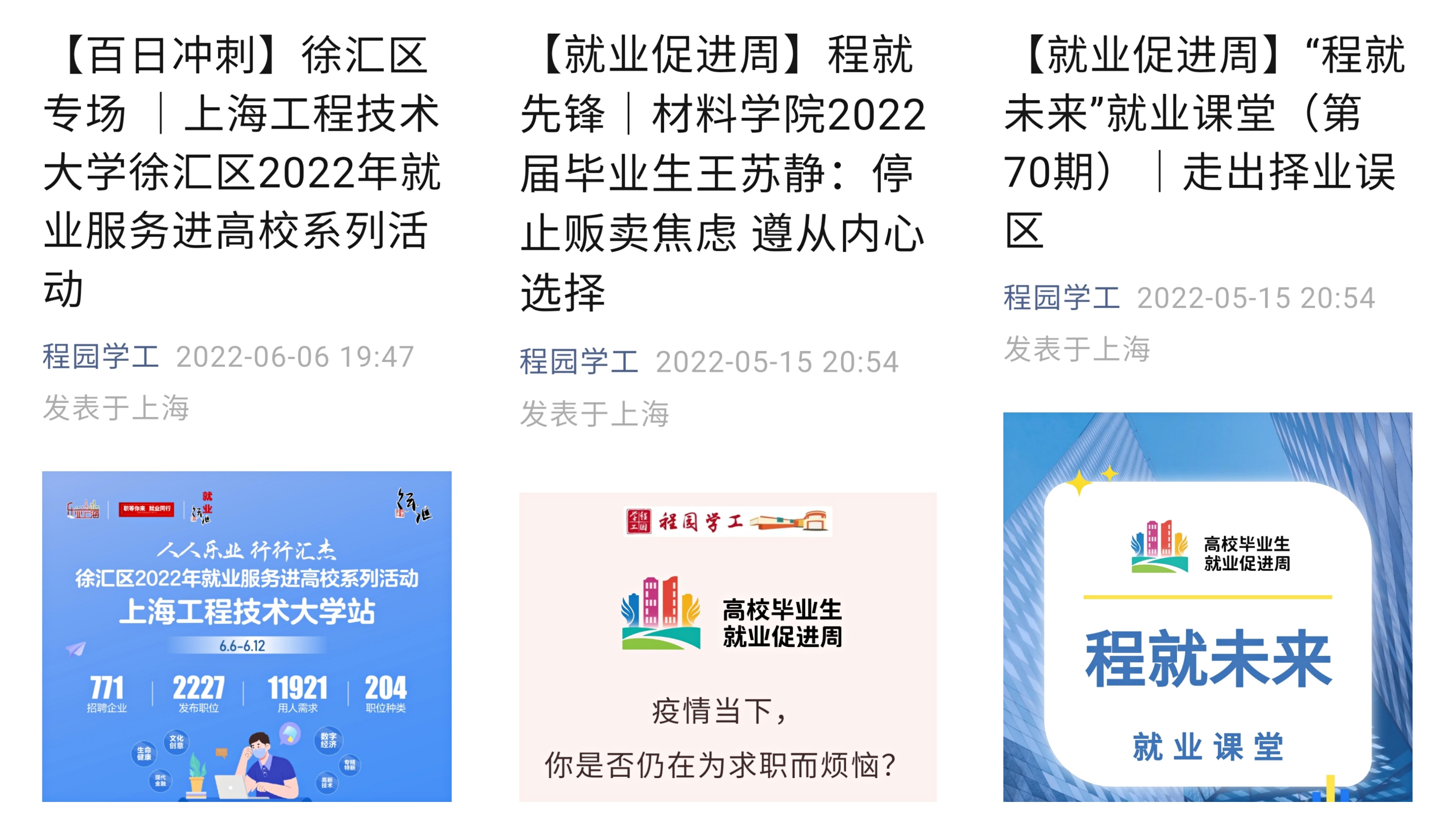 针对高频次核酸抗原检测、毕业生时间碎片化的特点,学校积极探索“化整为零、小群多路、错峰调控”的教育模式,用短小快捷灵活的“云”微课保证就业指导的深度、质量与成效。开设“程就未来”“云”课堂,聘请人社部门专家、资深HR、知名培训机构分层分类讲授就业形势与政策、简历制作技巧、面试通关要诀,方便学生随时“点播”。与松江人社共建“程园求职云驿站”,分期分批开展简历修改、压力纾解、生涯咨询、模拟面试等,方便学生按需“点菜”。