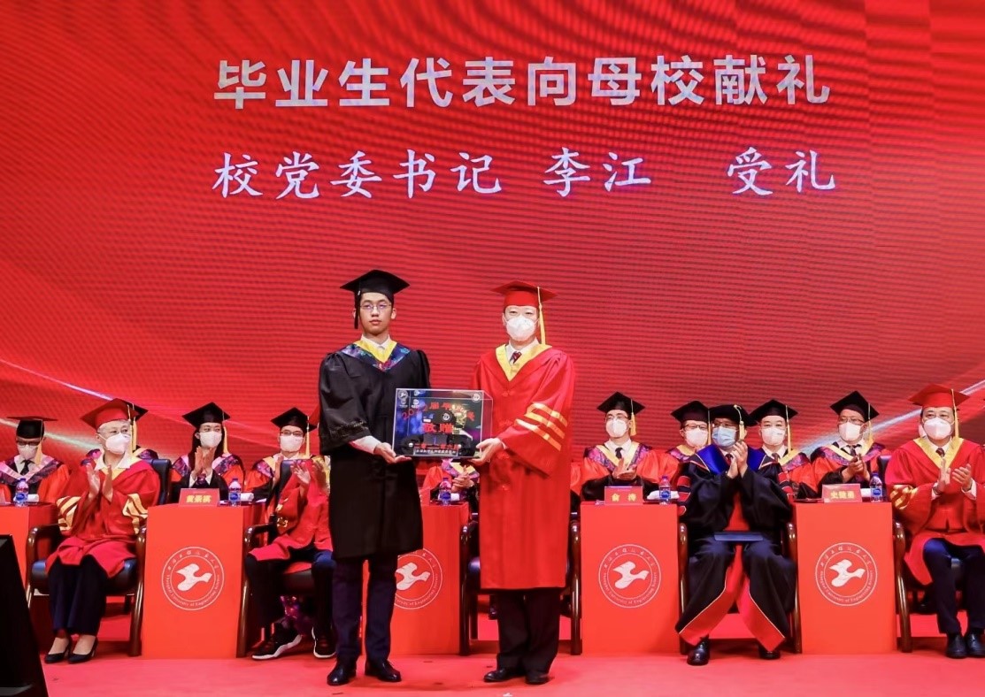 校党委副书记、工会主席史健勇,校党委副书记、纪委书记门妍萍为毕业生代表赠送了毕业礼物。