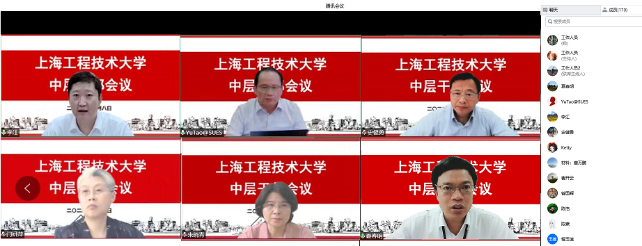 9月8日下午,学校中层干部会议以线上视频会议方式举行,主要对新学期重点工作进行部署推进。会上,党委书记李江,党委副书记、校长俞涛分别传达了2022年秋季上海高校党政负责干部会议上党政领导的讲话精神,并做了重要讲话;党委副书记、工会主席史健勇通报了学校 2021年度选人用人工作评议结果及问题整改措施;校领导副职对分管领域的重点工作进行了部署。党委书记李江,党委副书记、校长俞涛,党委副书记、工会主席史健勇,党委副书记、纪委书记门妍萍,党委副书记、副校长朱晓青,党委常委、副校长夏春明出席会议,全体中层干部参加会议。会议由党委副书记、校长俞涛主持。