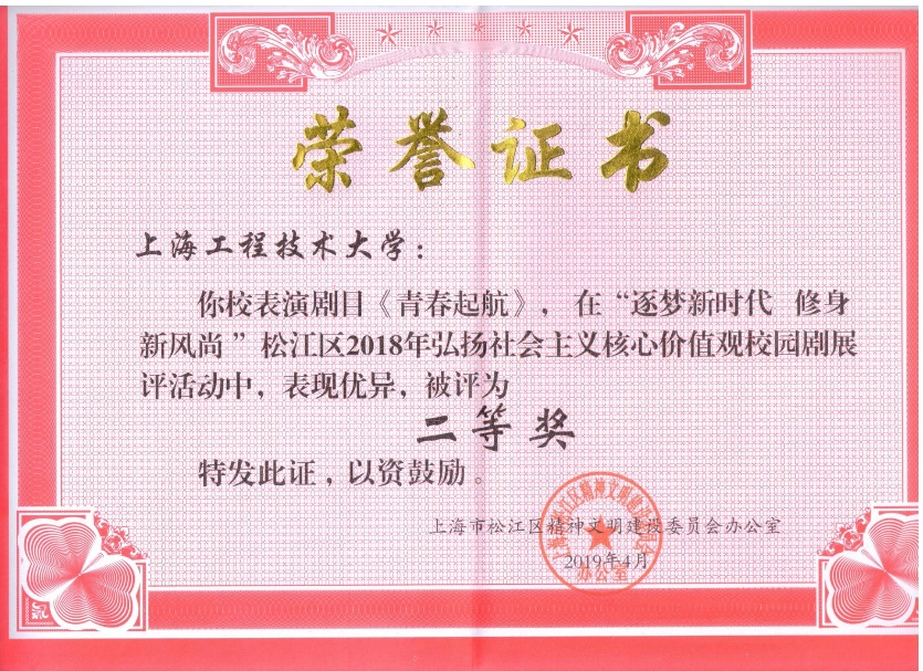 开幕式共有14项议程,其中2项议程为“多彩高校·人文行走”启动仪式和松江区2018年度弘扬社会主义核心价值观校园剧(优秀剧本)大赛颁奖仪式。我校被授予松江区修身立德市民体验基地,我校表演剧目《青春启航》被评为二等奖。