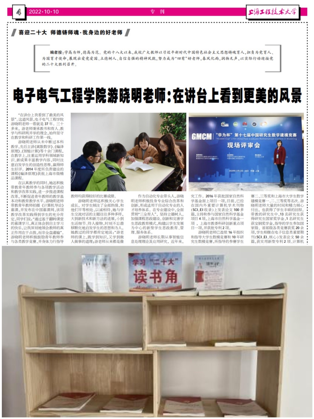强化典型宣传。在SUES风尚电气公众号及时推送“我的支部书记”等先进典型,首篇以《领雁奋飞、群雁齐飞,持续推进党支部高质量发展》为主题,介绍了学生第一党支部书记潜心支部建设,取得双创突出成果的事迹。学院党委积极宣传“我身边的好老师”,2022年10月10日校报的《喜迎二十大 师德铸师魂》专栏刊登了游晓明教授的报道《在讲台上看到更美的风景》。