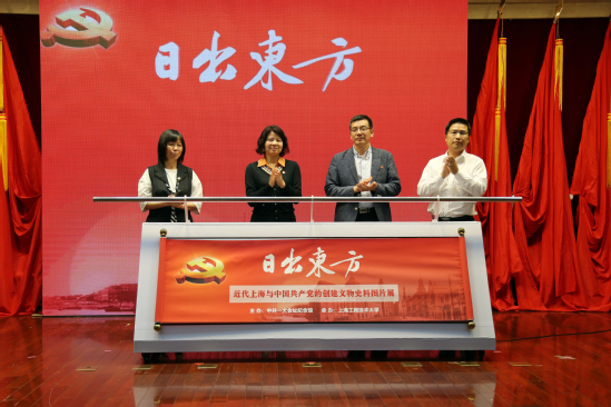 校党委副书记、副校长朱晓青,中共一大会址纪念馆副馆长、研究馆员徐云根,党委常委、党委组织部部长朱洪春,图书信息档案联合党总支书记李军为一大图片展开幕式隆重揭幕,并为学生党员讲解队队员颁发聘书。