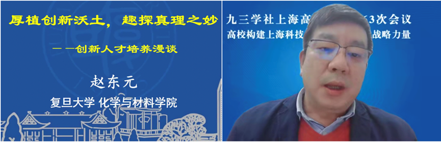 会上,中国科学院院士、第三世界科学院院士、复旦大学党委常委、统战部部长赵东元应邀作了《厚植创新沃土,趣探真理之妙——创新人才培养漫谈》的主旨报告,从科学的含义、科学家的定义和如何培育领军人才三方面对高校培育创新人才提出了具有建设性的建议。