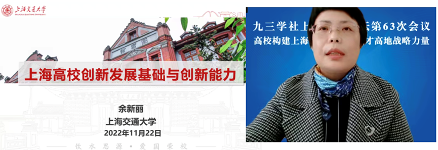 上海高校智库“高校学科发展与评估中心”首席专家、上海交通大学教育学院研究员、上海交通大学党委组织部副部长、党校常务副校长余新丽应邀作了题为《上海高校创新发展基础与创新能力》的主旨报告,介绍了上海高校创新发展基础、创新能力现状、在国家创新体系的地位和服务经济社会发展情况,以及近年来上海高校创新的突出成效。