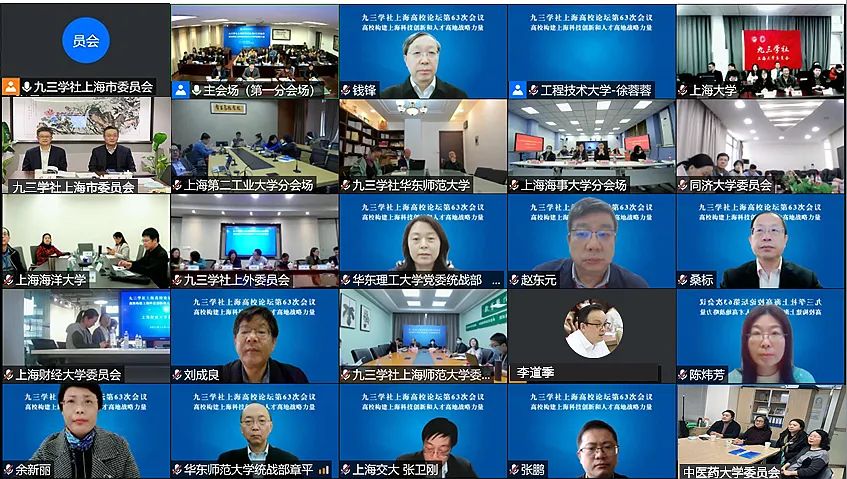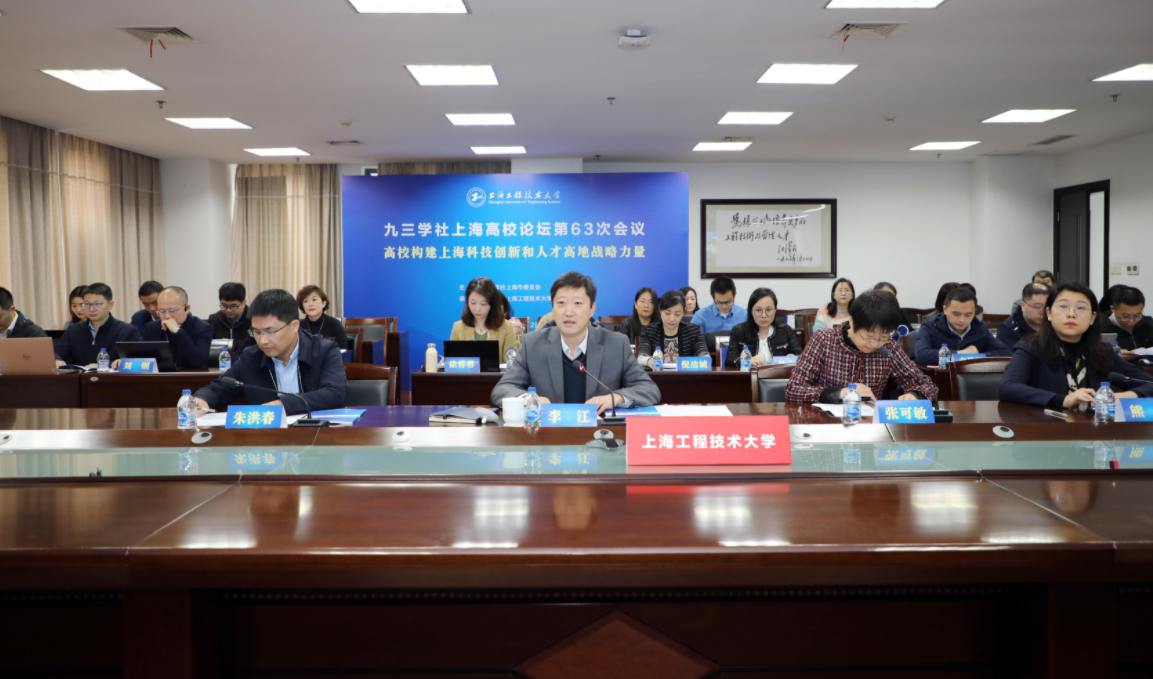 11月22日,九三学社上海高校论坛第63次会议在我校召开。市政协副主席、九三学社市委主委、中国工程院院士钱锋,上海工程技术大学党委书记李江,九三学社市委专职副主委周锋,副主委刘成良、杨守业,社市委教育专门委员会主任李道季,上海市教卫工作党委统战处四级调研员汪彦出席会议。会议由九三学社上海工程技术大学委员会主办,来自上海15所大学的九三学社社员以线上线下的形式参会,并围绕“高校构建上海科技创新和人才高地战略力量”主题进行研讨。九三学社上海工程技术大学委员会主委张可敏主持会议。
