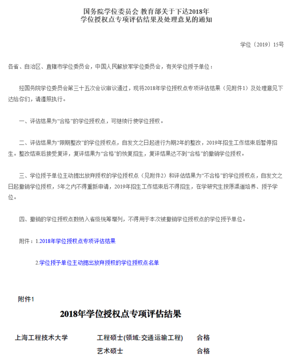 近日,国务院学位委员会、教育部发布了《国务院学位委员会 教育部关于下达2018年学位授权点专项评估结果及处理意见的通知》(学位[2019]15号),其中上海工程技术大学工程硕士(领域:交通运输工程)和艺术硕士两个专业学位授权点评估结果为合格。
