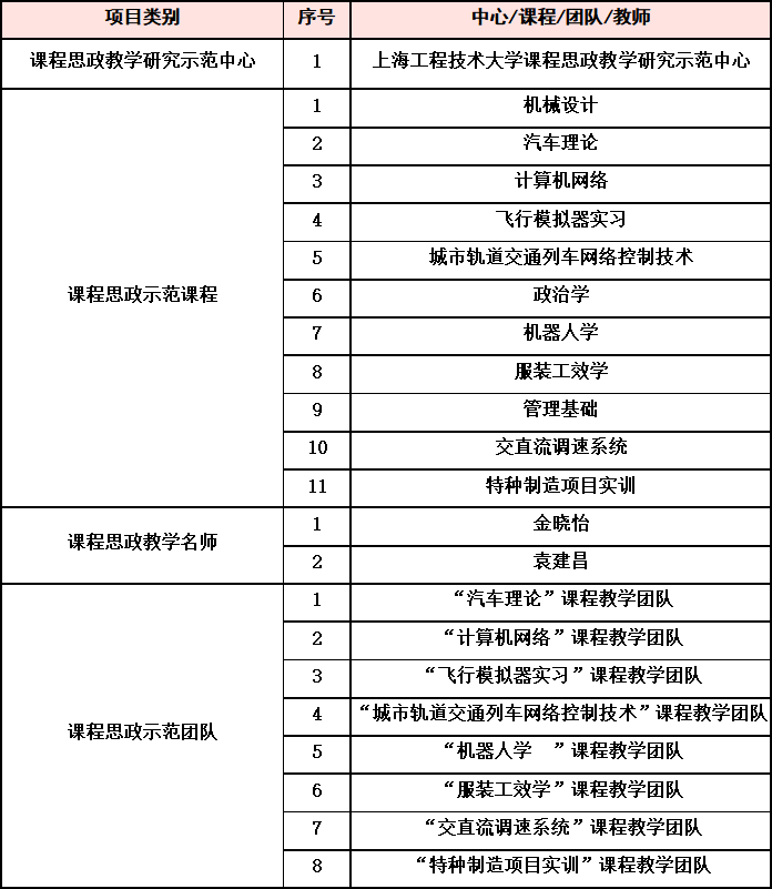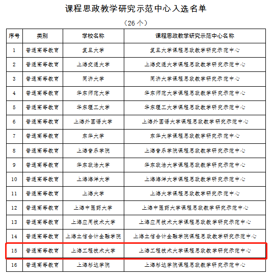 近日,中共上海市教育卫生工作委员会、上海市教育委员会公布了课程思政示范项目名单,我校党委书记李江教授主持的“上海工程技术大学课程思政教学研究示范中心”(以下简称“中心”)获批课程思政教学研究示范中心,11门课程获批课程思政示范课程,2人获批课程思政教学名师,8个教学团队获批课程思政示范团队。
