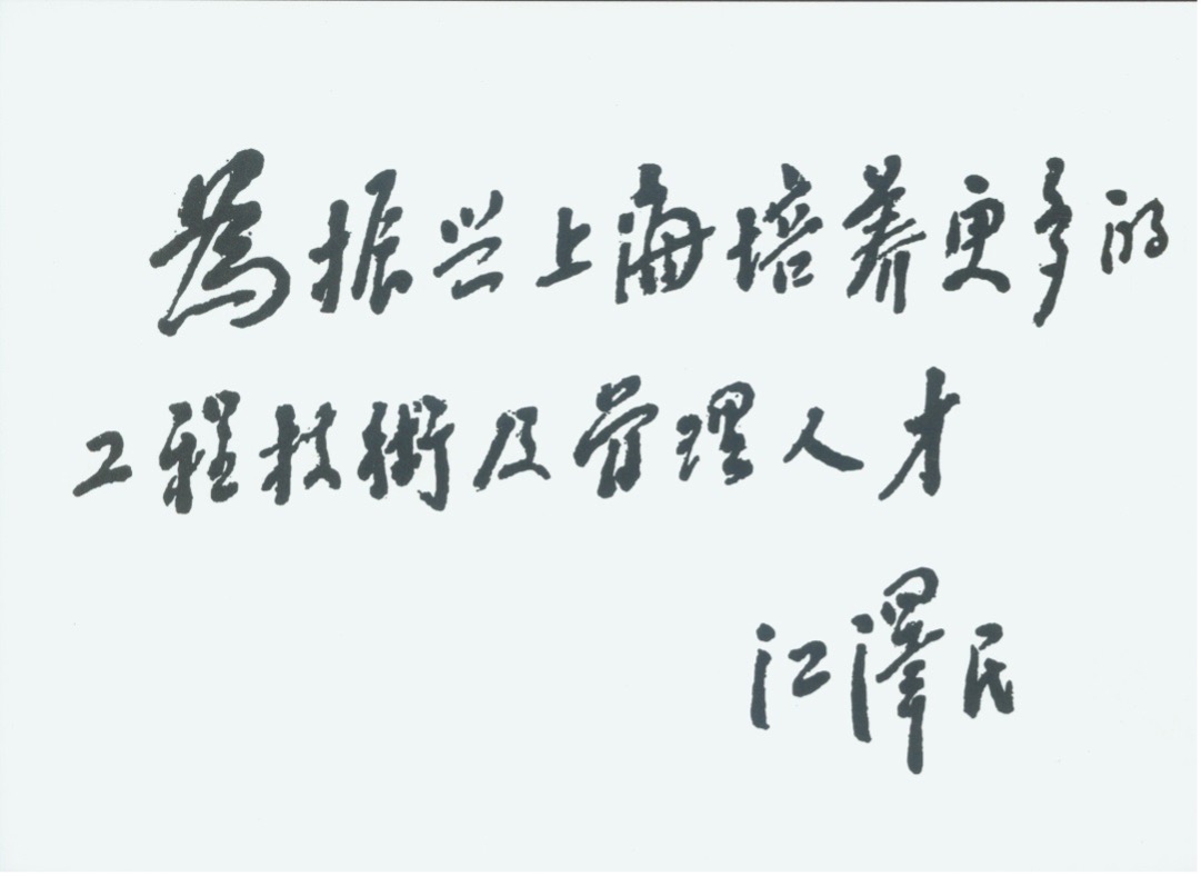 斯人已逝,风范长存。江泽民同志对我校办学目标的确立,起到决定性的作用。在上海工作期间,他出席了在上海交通大学机电分校和华东纺织工学院分院基础上建立的上海工程技术大学成立大会,寄语学校:“我衷心地期望这个学校是我们上海的工业的台柱,能够真正对我们上海的工业建设,对我们上海的‘四化’,振兴上海,起到巨大的作用。”并为学校成立欣然题词,“为振兴上海,培养更多的工程技术及管理人才”。