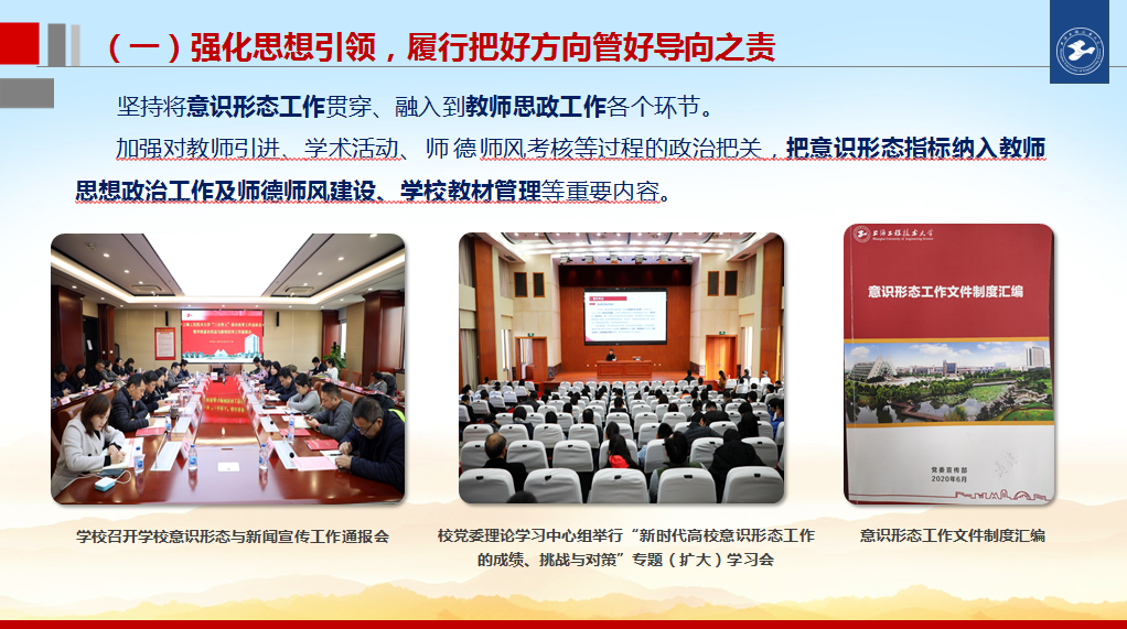 强化思想引领,履行把好方向管好导向之责。学校坚持将意识形态工作贯穿、融入到教师思政工作各个环节。加强对教师引进、学术活动、师德师风考核等过程的政治把关,把意识形态指标纳入教师思想政治工作及师德师风建设、学校教材管理等重要内容。抓好关键领域,履行维护稳定筑牢阵地之责。强化对各类哲学社会科学报告会、研讨会、讲座论坛以及教师课堂和各类思想文化阵地的规范管理。校园网发布的各类讲座和论坛经过各部门层层审核,严格贯彻落实网络意识形态工作责任制。