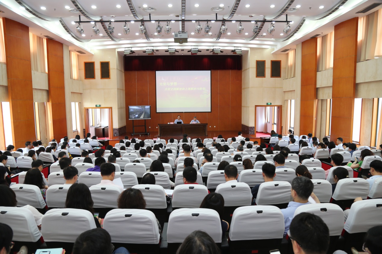 6月28日,为深入贯彻“不忘初心、牢记使命”主题教育精神,庆祝新中国成立和上海解放70周年,学校召开党委中心组扩大学习会,上海党史学会会长、原上海大学党委副书记忻平教授应邀来校,作了题为“不忘初心、牢记使命——庆祝上海解放70周年”的专题报告。校党委书记李江,校党委副书记鲁嘉华,校党委副书记、副校长朱晓青,副校长姚秀平、王岩松,中心组成员、中层干部、支部书记、机关科级以上干部、辅导员200余人参加了会议。会议由鲁嘉华副书记主持。