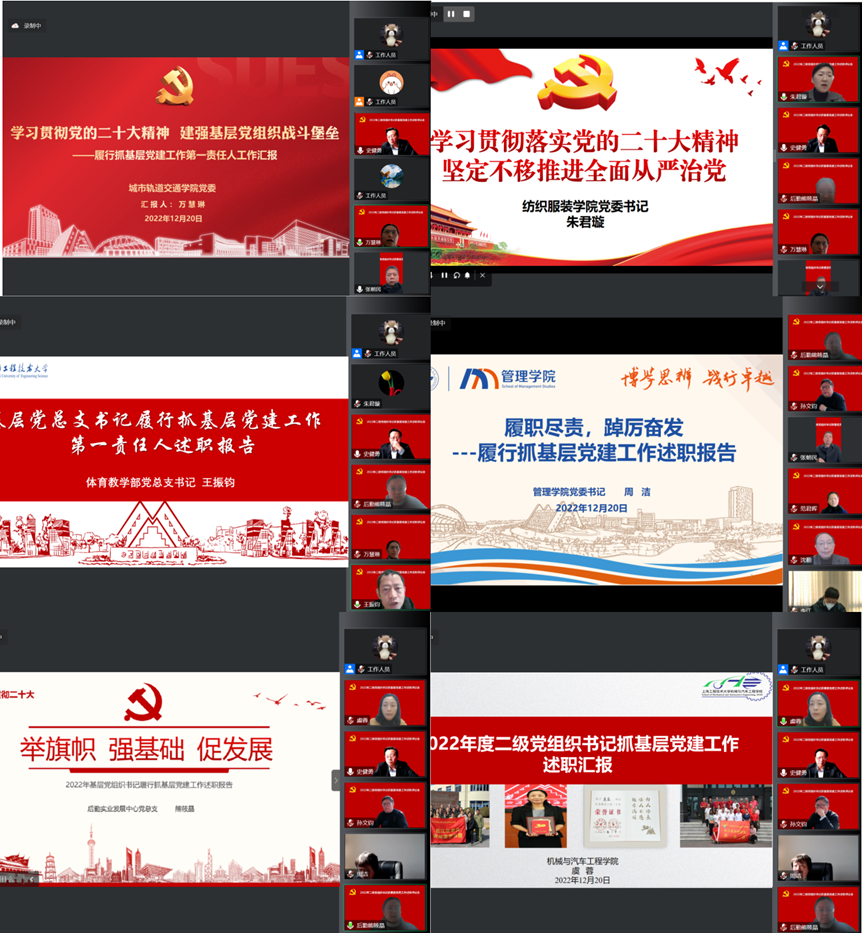 学校党委书记李江肯定了各二级党组织书记一年来的工作。他指出,各位书记带领基层党组织和党员,在贯彻落实党的二十大精神和市十二次党代会精神、助力大上海保卫战、落实巡视“回头看”整改任务,提升基层党建工作质量等方面取得了较好成绩。同时,对标党的二十大对高校提出的更高要求和广大师生的更高期盼,李江书记提出四点工作要求,一是抓住深入学习贯彻落实党的二十大精神这“一根主线”,切实加强对党的创新理论的学习。按照“全面学习、全面把握、全面落实”的要求,运用好《党的二十大报告辅导读本》《党的二十大报告学习辅导百问》等辅导材料,切实把党的二十大关于党的建设和组织工作的各项部署要求落到实处。二是增强党组织的政治功能和组织功能这“两项功能”,进一步推进基层党组织全面进步全面过硬。要以“上海党建工作示范高校”创建为契机,落实好“五个到位”的要求,实现党建工作从发挥保障作用到发挥引领作用的转变、从党务工作到党建工作的转变、从要素建设到功能建设转变。三是抓好二级党组织、基层党支部、党员“三个层面”的组织体系,推进党建工作与事业发展深度融合,聚焦议事决策、委员作用发挥、队伍建设等,持续推动党建高质量创新发展。四是提高政治能力、团结协作能力、做思想工作的能力和创新能力“四种能力”,切实抓好班子、带好队伍。要把党建和学院发展主动融入到学校事业发展中、融入到服务国家战略和上海建设中。