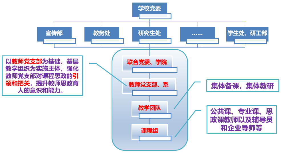 学校以教师党支部为基础,基层教学组织为实施主体,强化教师党支部对课程思政的引领和把关,提升教师思政育人的意识和能力。依托教学团队,组织集体备课,集体教研。由公共课、专业课、思政课教师以及辅导员和企业导师等组成课程组开展课程思政教研活动。