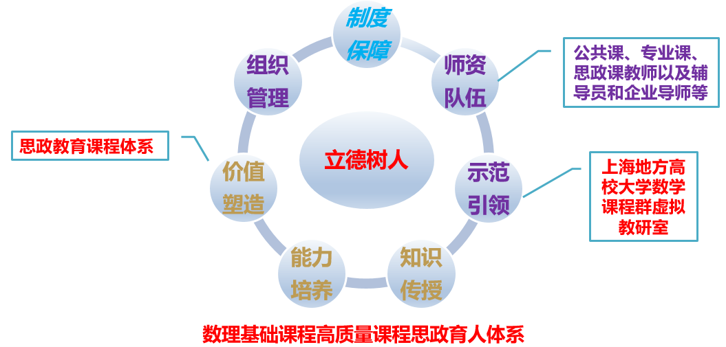 构建制度保障、组织管理、师资队伍、知识传授、能力培养、价值塑造、示范引领“七位一体”的数理基础课程高质量课程思政育人体系。以国家、上海市和学校相关课程思政制度为保障,学院制定推进课程思政的具体实施意见等;建设学校党委统一领导、党政齐抓共管、部门协同配合、校院两级管理的课程思政体建设工作体系;以公共课、专业课、思政课教师以及辅导员和企业导师等组成优秀的课程思政队伍;向学生传授数理基础课程知识,为专业课程的学习奠定理论知识基础;培养学生的逻辑思维能力、空间想象能力和计算能力等;价值塑造位居人才培养体系之首,是人才培养的核心;依托学校“上海地方高校大学数学课程群虚拟教研室”,与兄弟高校教师共同推进大学数学课程思政教研活动,引领上海高校乃至全国高校的大学数学课程思政。