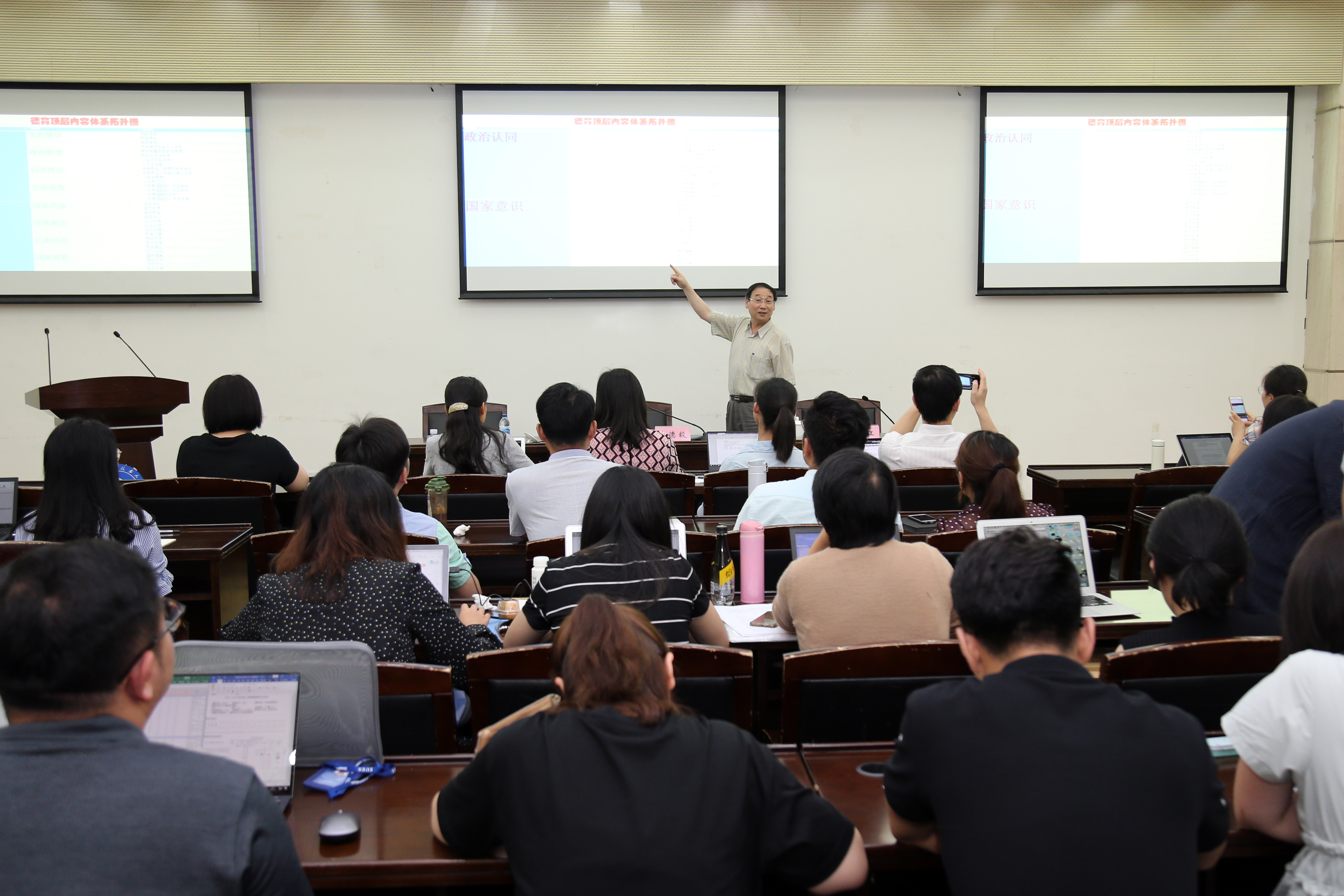 高德毅教授还为我校教师做了题为“从思政课程拓展到课程思政”的精彩报告。针对过去德育工作中知识传授和价值引领“两张皮”的现象,高教授指出,教育系统要从战略高度构建思想政治教育课程体系,推动“思政课程”拓展到“课程思政”,探索教书与育人相统一的现实途径。高教授重点阐释了“课程思政”的理念,即360度德育大熔炉式的课程体系创新思路;并结合上海市高校实际案例,讲解了“课程思政”在专业课程中的操作经验。最后,高德毅教授指出,提升教师育德意识和育德能力是思政教育工作的关键之关键,教师要在价值传播中凝聚知识底蕴,在知识传播中强调价值引领。