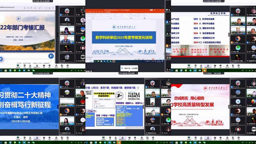 校党委副书记、校长俞涛对各部门的汇报总结给予了充分肯定,感谢全体教职员工在不平凡的2022年一起走过了抗疫之路,建立了深厚的“战斗”友情。他指出,各部门都是学校发展完整拼图中不可或缺的“那一块”,每一块的绚丽多彩方能使学校事业发展更加令人瞩目。他强调,各部门要认真对待考核工作,要注重与学校党委的要求比、与同类高校的学科专业比,既要比各项指标的完成率,更要比对上海经济与城市发展以及对学校高质量发展的贡献度。他希望,各部门在新的一年群策群力,为学校博士学位授予单位和博士学位点建设等重点工作做出积极贡献。