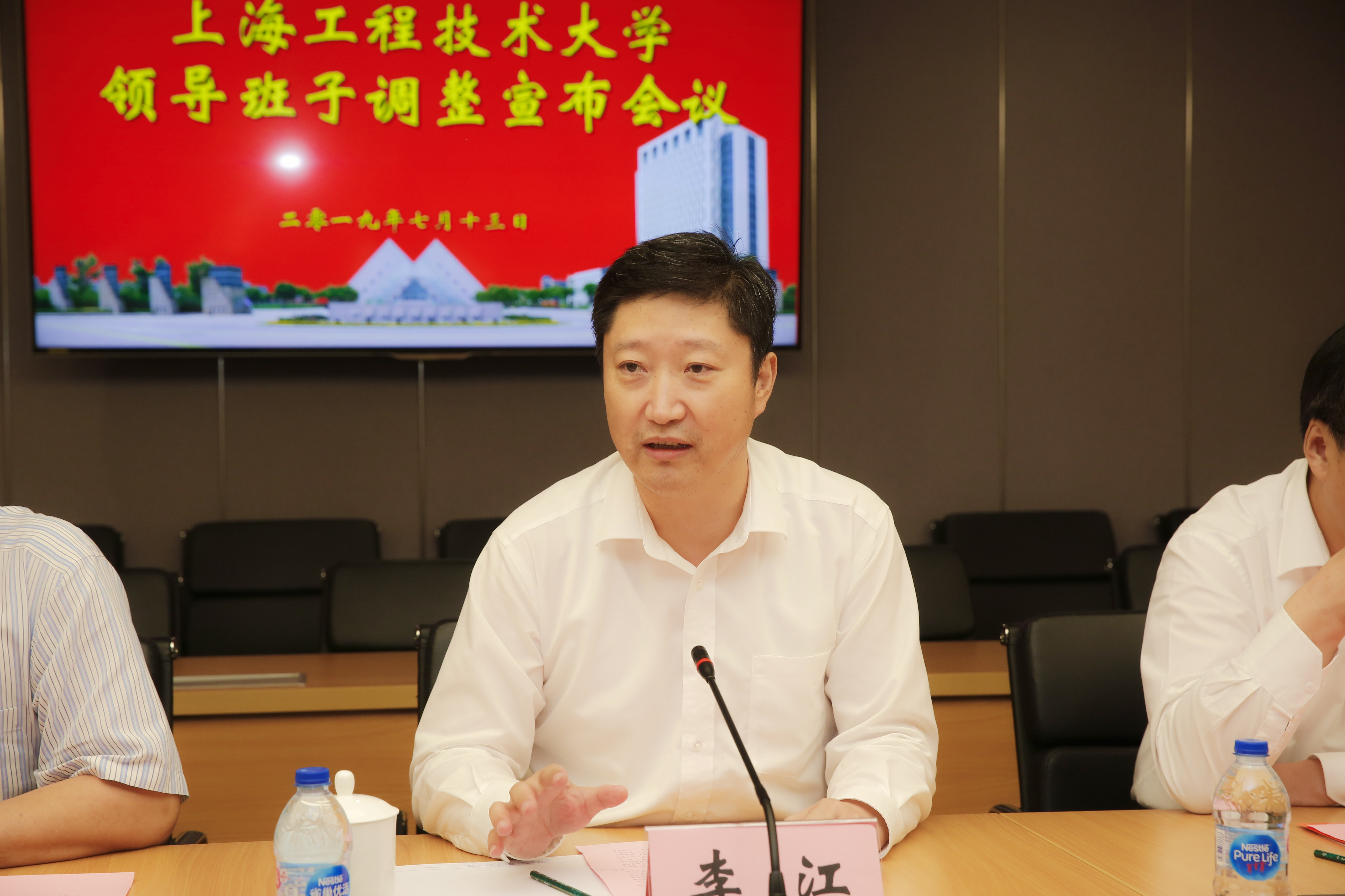 7月13日下午,我校在长宁校区科创楼725会议室召开领导班子调整宣布会,市委组织部、市教卫工作党委相关领导在会上宣布了我校领导班子调整决定。市教卫工作党委副书记滕建勇、市委组织部宣教科技干部处副处长窦德才、市教卫工作党委组织干部处处长罗立刚出席会议,全体校领导、党委常委、综合部门负责人出席会议。会议由校党委书记李江同志主持。
