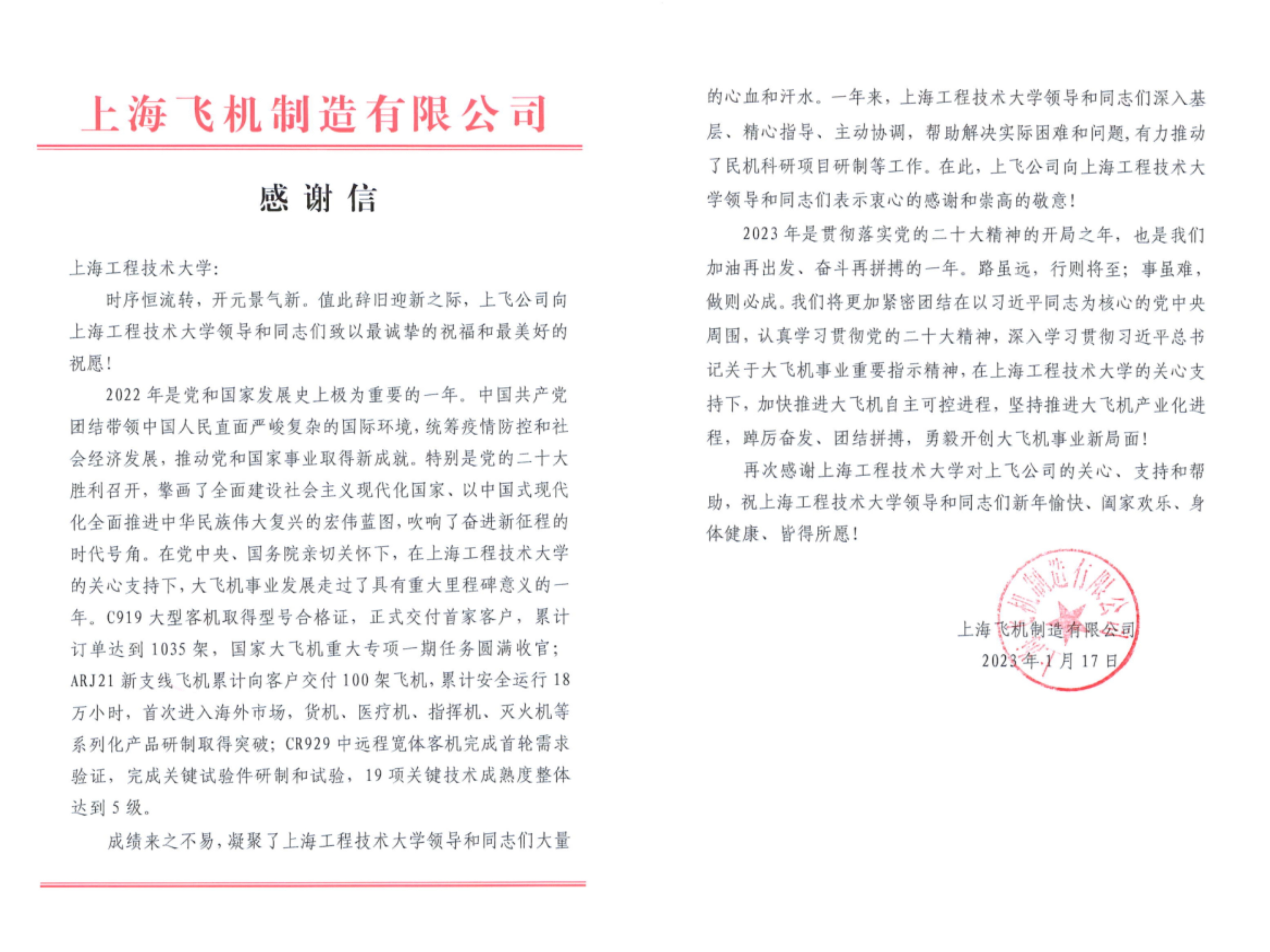福兔迎春崭新篇,瑞鹤呈祥喜气来。值此辞旧迎新之际,我校收到来自商飞上海飞机制造有限公司的感谢信,信中表示,2022年是党和国家发展史上极为重要的一年,特别是党的二十大胜利召开,擎画了全面建设社会主义现代化国家、以中国式现代化全面推进中华民族伟大复兴的宏伟蓝图,吹响了奋进新征程的时代号角。感谢信充分肯定了上海工程技术大学领导和同志们深入基层、精心指导、主动协调、解决难题,有力推动了民机科研项目研制等工作,助力大飞机事业发展。在过去的一年,商飞取得了C919大型客机型号合格证,正式交付首家客户等具有重大里程碑意义的成绩,成绩来之不易,也凝聚了我校领导和同志们大量的心血和汗水。