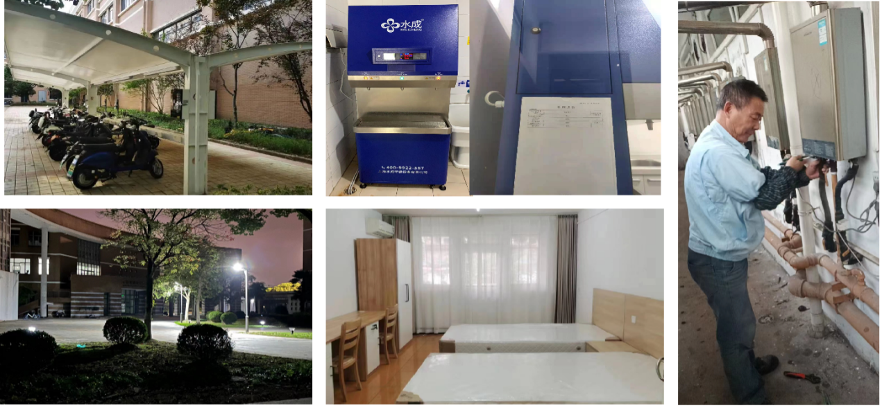 后勤中心心系师生,依托学校实事工程建设为师生办实事。在图书馆、行政楼、实训楼共计安装159个草坪灯、35个庭院灯;在行政楼、实训楼、图文信息中心安装8台直饮水机,学生公寓更新开水机45台;在实训5号楼安装电动自行车充电桩40个,实训1号楼优化助动车充电桩60个;更新学生公寓燃气热水器300台;完成辅导员房间环境优化13间。