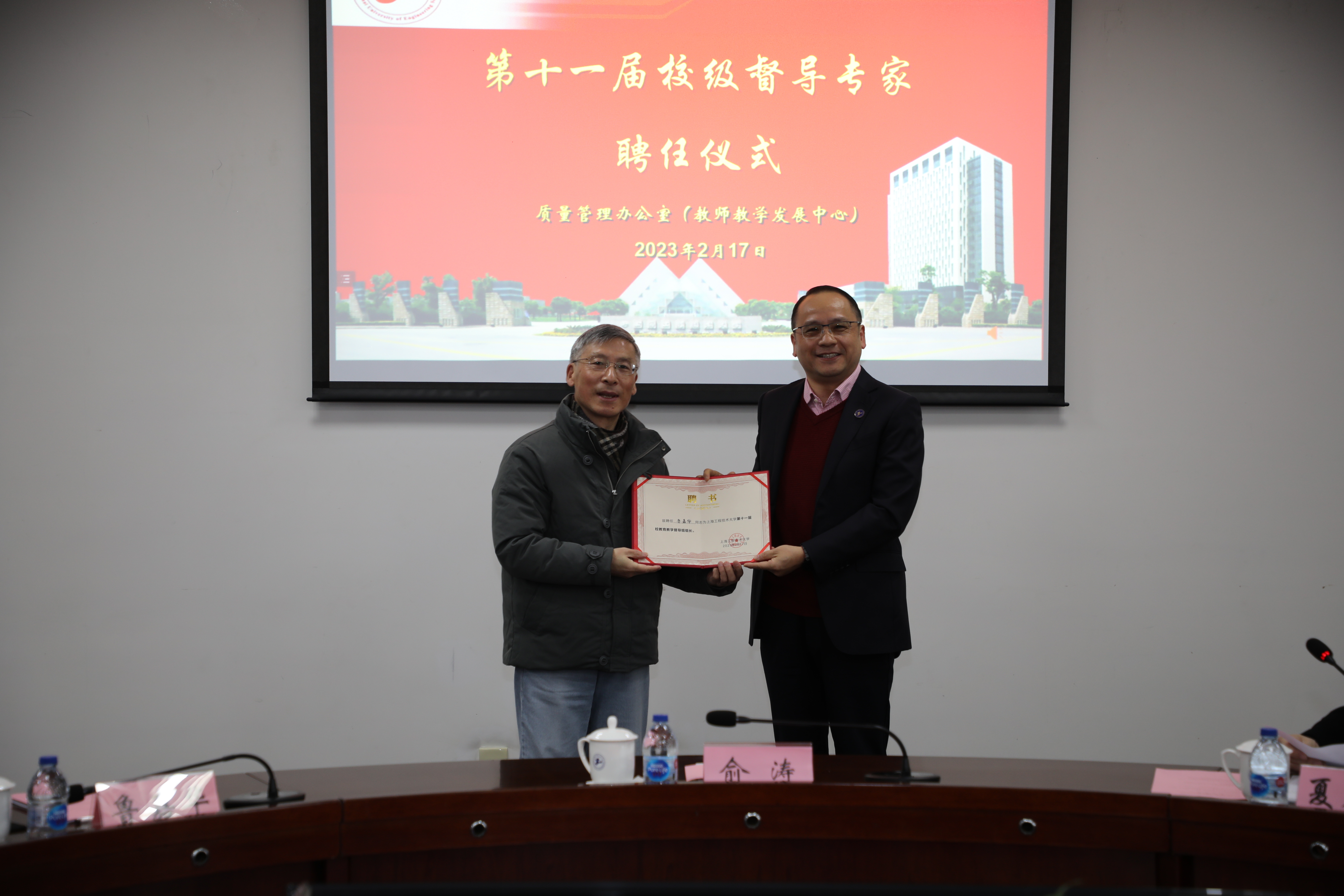 夏春明副校长宣读第十一届教育教学督导名单,俞涛校长为新一届督导颁发聘任证书并合影留念。