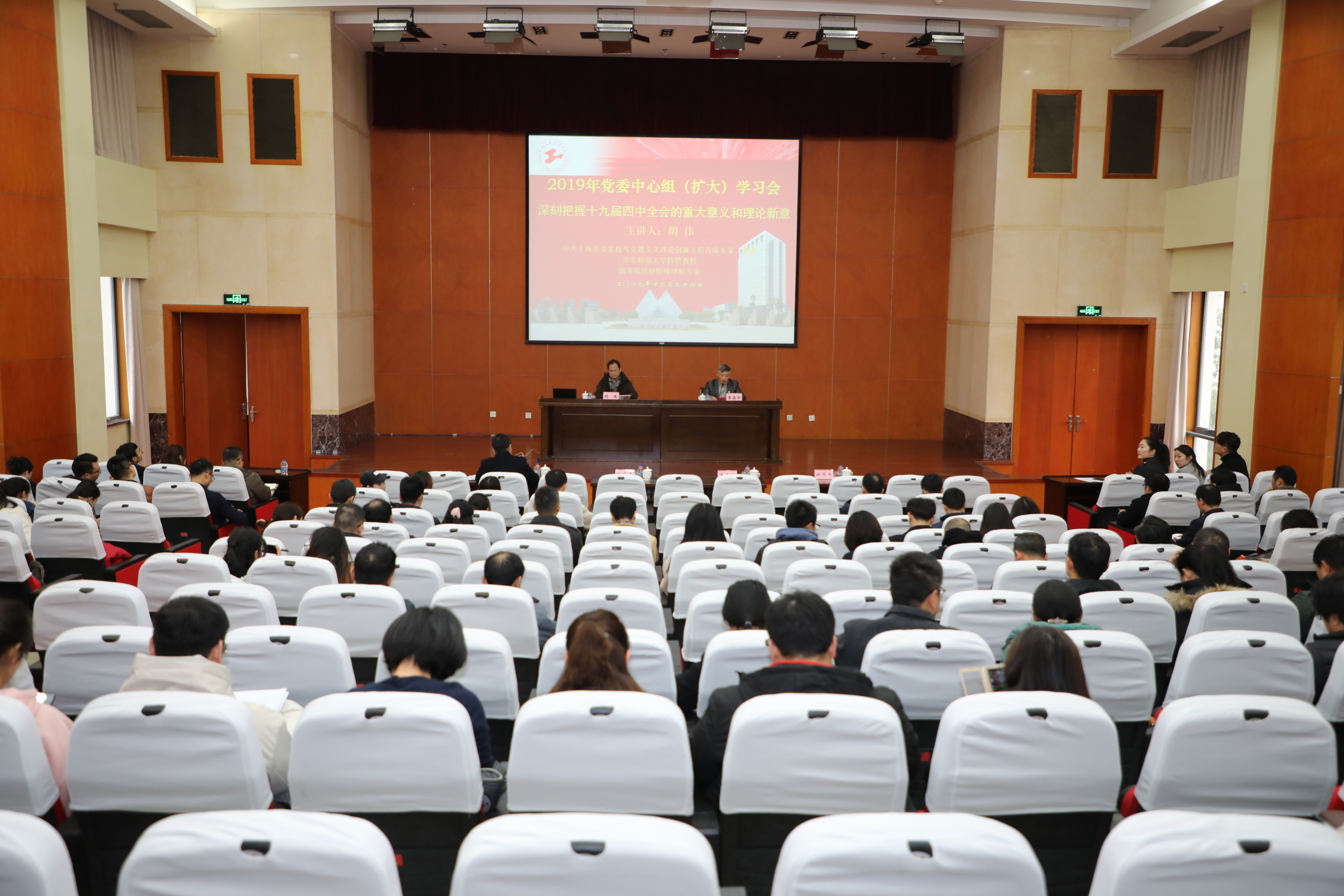 党的十九届四中全会对坚持和完善中国特色社会主义制度、推进国家治理体系和治理能力现代化作出了重大战略部署,为了更好地把握全会精神的内涵与实质,推动学校各项事业科学发展,12月26日下午,校党委中心组在行政楼B301会议室举行扩大专题学习会。会议邀请上海市“学习贯彻党的十九届四中全会精神”宣讲团成员,中共上海市委党校马克思主义理论创新工程首席专家、教授,华东师范大学特聘教授胡伟作了《深刻把握十九届四中全会的重大意义和理论新意》的主题报告。校党委中心组成员、中层干部、支部书记、机关科级以上干部、辅导员等200余人参加会议,学习会由校党委副书记鲁嘉华主持。