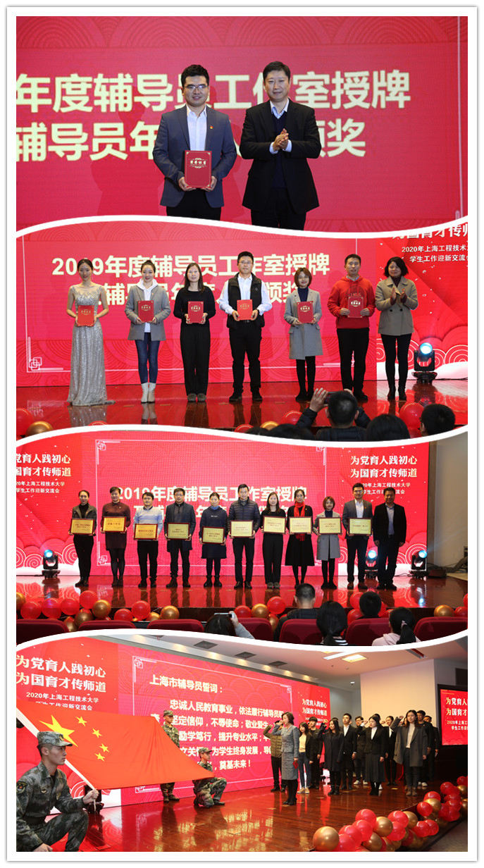 会上,校党委书记李江为2019上海高校辅导员年度人物获得者杨建豪颁发证书。校党委副书记、副校长朱晓青为荣获上海工程技术大学年度人物奖和提名奖的7位老师颁发证书。校党委常委、宣传部部长徐阳为2019年学校建立培育的10个辅导员工作室授牌。此外,由学生工作部(处)长、研究生工作部部长朱蓓老师带领2019年全体16名新入职辅导员老师进行了集体宣誓。