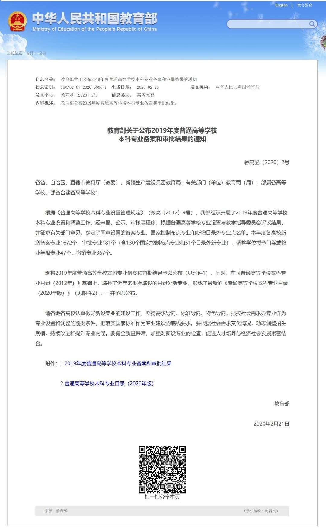 近日,教育部发布了《教育部关于公布2019年度普通高等学校本科专业备案和审批结果的通知》(教高函〔2020〕2号),我校推荐申请设置的智能制造工程、人工智能、养老服务管理3个本科专业成功获批,其中养老服务管理专业是目录外新专业。