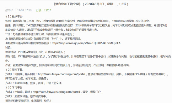 为了上好线上教学第一课,张书华教授积极参加学校组织的“超星泛雅”和“雨课堂”教学平台使用培训,通过聆听专家讲解,她感受到网络教学平台不仅会在疫情期间线上授课发挥巨大作用,对助力日常教学也非常有益。由于有2003年非典期间的教学经历,她意识到要尽早学习和准备网上授课。春节期间,她就开始拆分授课PPT,按照学习单元组织授课内容,努力学习录播和直播课程方法,完成了微课制作,并上传到超星泛雅平台。她在超星泛雅平台《聚合物加工流变学》精品课程网站的基础上,进一步更新和丰富了课程资料。