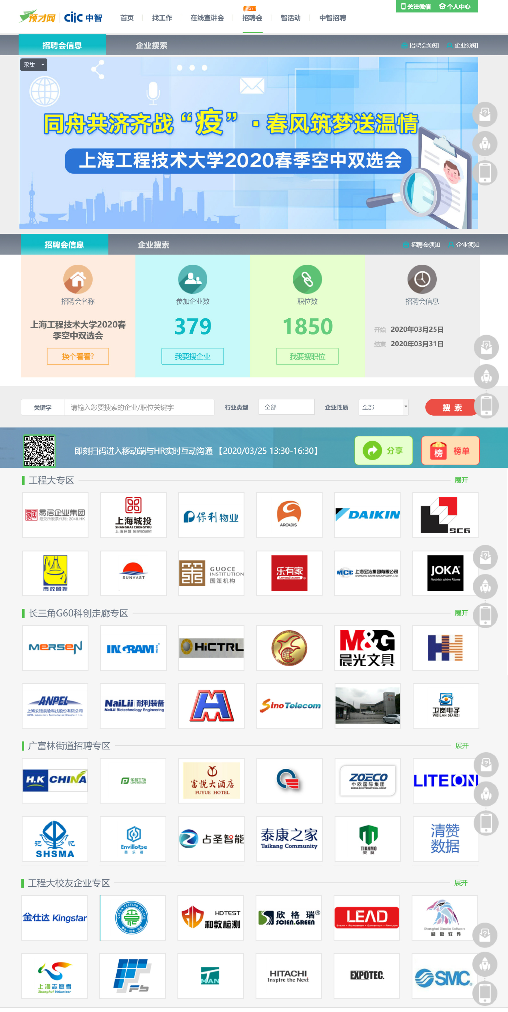 本次空中双选会共吸引379家企业报名参加,提供工作岗位1850余个,岗位需求人数近8000人,1603位毕业生全程参与本次空中双选会,在线投递简历达12208次,平均每位毕业生投递简历7.62次。学校主动服务“长三角G60科创走廊建设”等国家战略,积极对接长三角“G60科创走廊”联席办公室及G60九城人社部门,特别设立“长三角G60科创走廊”专区,吸引了100余家G60科创走廊企业参与线上招聘。同时,学校还充分积极挖掘校友资源,通过校友会平台积极设立校友企业专区,吸引30余家校友企业参加。空中双选会期间,用人单位依托在线平台发布招聘信息,进行简历的精准查询和精确接收,毕业生则通过在线平台查看招聘信息并在线简历投递,通过语音和视频等“融媒体”方式参加用人单位面试。为给毕业生提供更贴心、更暖心的就业服务,学校学生生涯发展教育服务中心全体教师还携手各学院就业辅导员联手组建了服务咨询微信群,在线解答学生求职过程中遇到的各种问题。
