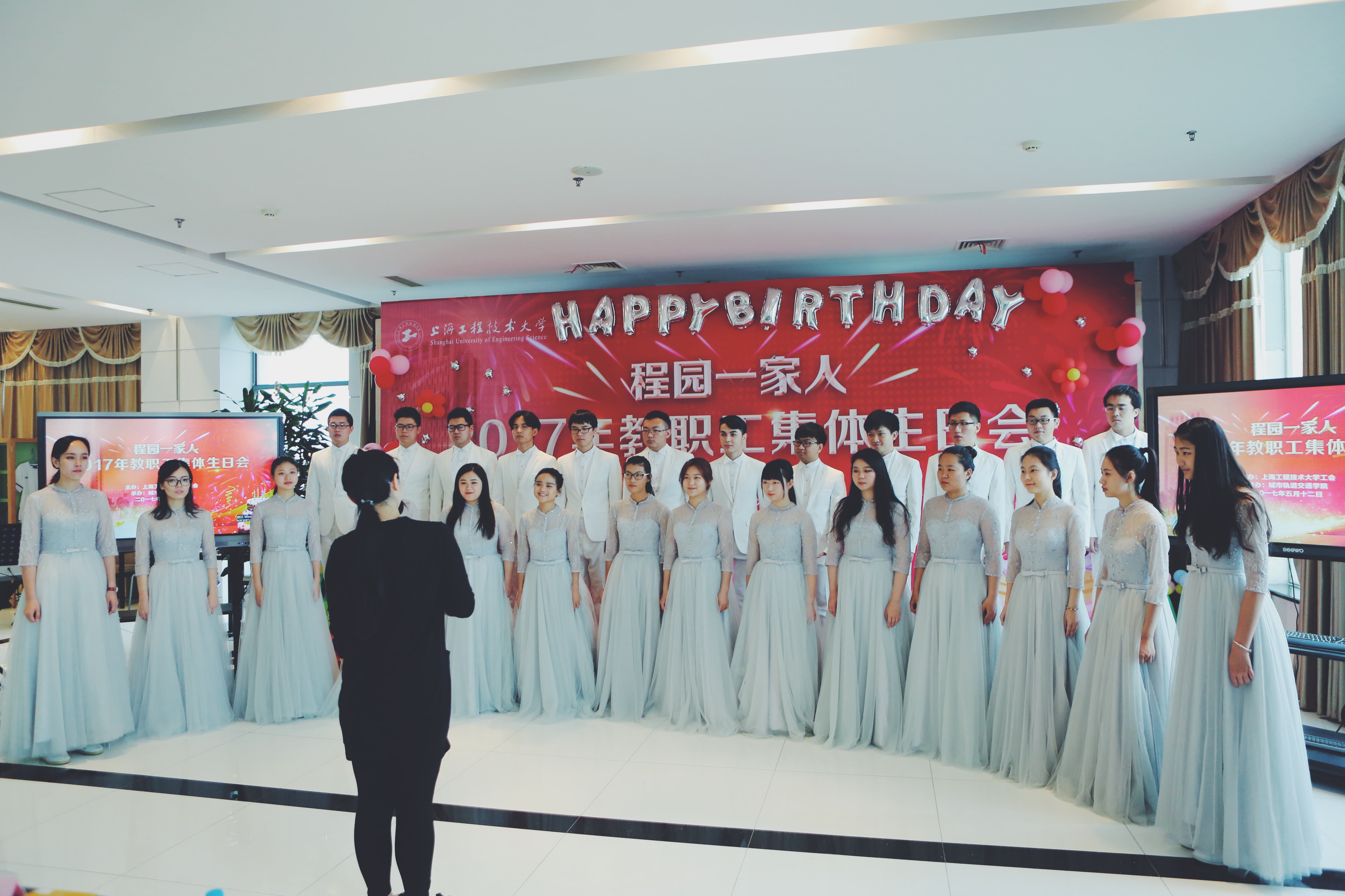 吹蜡烛,许愿,切蛋糕,生日会在大家高涨的热情中进入了高潮。团委合唱团再次给老师们带来了精彩的节目,伴随着合唱《工程大我们一起走过》的歌声,生日会进入了尾声。最后,全体人员上台合影留念,让镜头定格下这美好的时光。