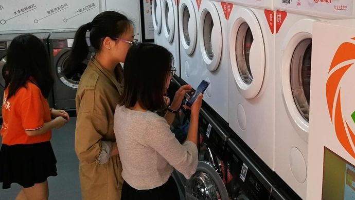 最近很多同学发现,宿舍区16号楼原来停放自行车的地方华丽转身,变成了高大上的自助洗衣房,18台共享洗衣机、烘干机、洗鞋机依次排开。